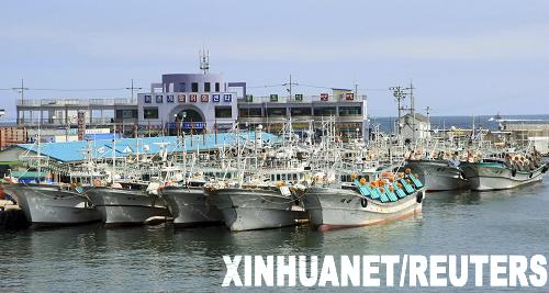 7月30日,渔船停靠在首尔东北约330公里的一个港口。韩国联合通讯社当日援引韩国军方人士的话报道,一艘韩国渔船当天上午6时30左右在江原道以东海面越过南北海朝韩两国分界线进入朝鲜水域,被朝鲜警备艇拖走扣留。新华社/路透