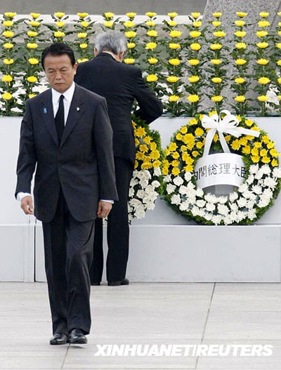 8月6日,在日本广岛,日本首相麻生太郎在向广岛原子弹轰炸的死难者献花后离开。今年是日本广岛遭受原子弹轰炸64周年,日本各界人士在广岛举行各种纪念活动,悼念原子弹爆炸死难者,祈祷世界和平。为敦促发动侵略战争的日本尽快投降,美军于1945年8月6日和9日分别向日本广岛市和长崎市投下原子弹。日本是迄今世界上唯一一个遭受过原子弹轰炸的国家。新华社/路透