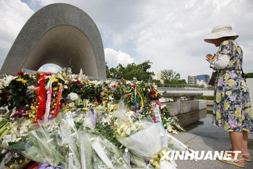 8月5日,在日本广岛和平纪念公园,一位女士站在原子弹爆炸死难者纪念碑前,悼念死去的亲属。新华社记者任正来摄