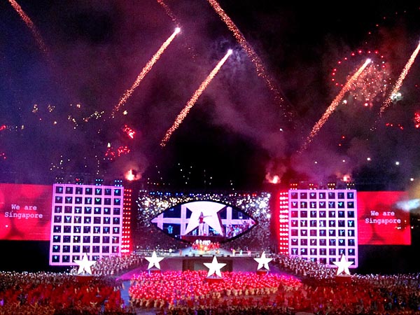 8月9日,焰火在滨海湾浮动舞台上空燃放。当日,新加坡举行文艺表演和军事表演等活动,庆祝建国44周年。新华社记者张永兴摄