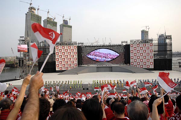 8月9日,市民在观看滨海湾浮动舞台上进行的表演。新华社记者张永兴摄