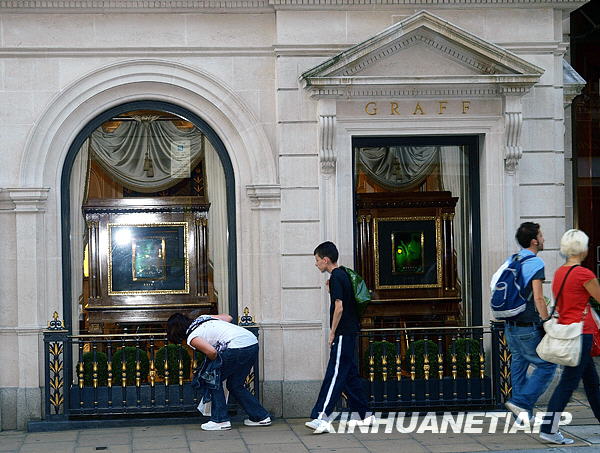 8月11日,两名行人在英国伦敦格拉夫钻石公司的一家珠宝店外向里张望。 英国伦敦警察局当日发表声明说,两名穿着高档服装的劫匪上周进入英国格拉夫钻石公司的一家旗舰店内,劫走价值6500万美元的顶级珠宝。按英国媒体说法,这可能是英国历史上最大的珠宝抢劫案。新华社/法新