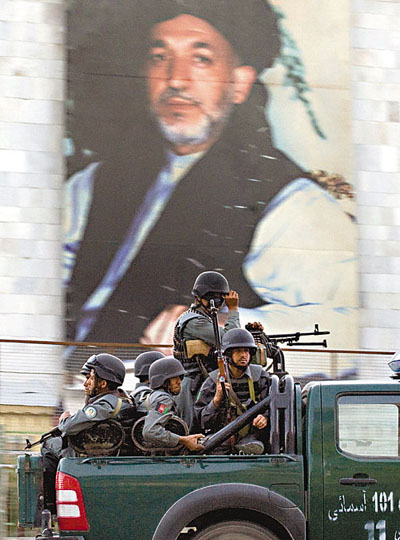 一队武装警察巡逻经过现任总统卡尔扎伊的选举海报