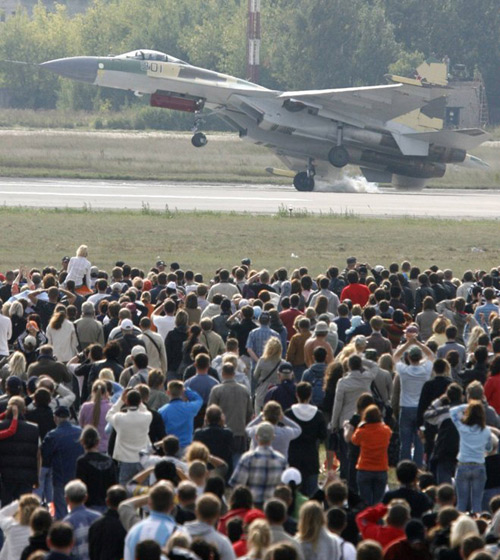 图片是8月22日周六在航展上苏-35飞行资料图。有参观者还误以为是俄新式战机在进行特技表演。照片清楚显示,飞机降落时发生倾斜,靠右侧起落架落地。驾驶该飞机的是第一个(2008年2月)驾驶苏-35的飞行员谢尔盖·伯格达。(梁小逸)