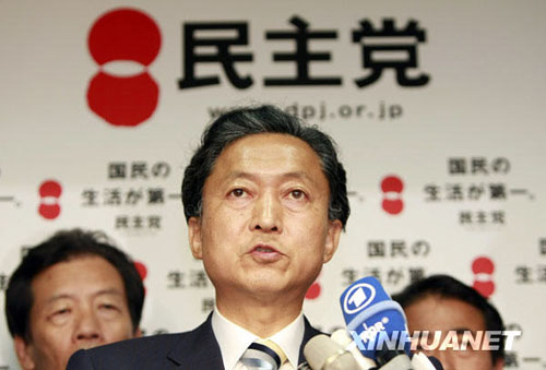 8月31日,在日本东京民主党总部,民主党党首鸠山由纪夫(前)在结束与党内高层举行的会议后,接受媒体访问。新华社记者任正来摄