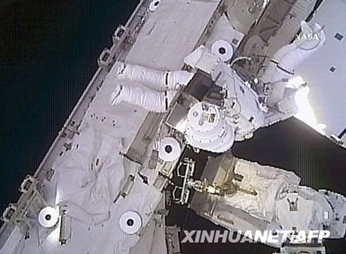 美国国家航空航天局9月1日发布的电视照片显示,已与国际空间站成功对接的“发现”号航天飞机上的宇航员尼克尔·斯托特(右)和丹尼·奥利瓦斯进行第一次太空行走。他们将换下一个如小汽车般大小的氨冷却水箱并完成一些零件升级与维护。新华社/法新