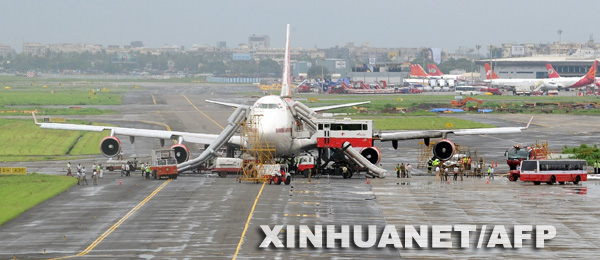 9月4日,在印度孟买的恰提拉帕提·希瓦吉国际机场,消防人员聚集在一架波音747飞机周围。