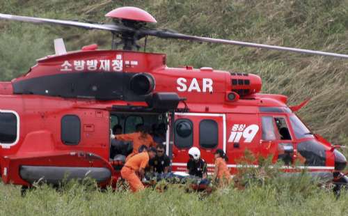 韩国救援人员七日将找到的一具尸体抬上直升机