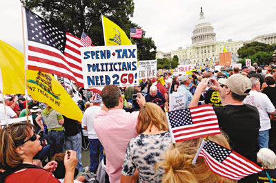 示威者逼爆宾夕法尼亚大道,连绵数个街区,齐向国会山庄浩浩荡荡前进。他们高举奥巴马和美国众议院议长佩洛西的肖像,以及写满“不要更多的开支,不要更多的税收,不要更多的谎言”、“支持奥巴马的医疗改革方案等于自杀”等各种各样的标语。