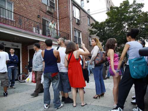 纽约反恐人员突击搜查皇后区一幢住宅,位宅内的居民在楼外等候。