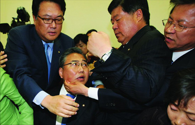 在韩国,执政的大国家党和反对党在外交政策等方面的分歧常常要用拳头来解决,会议室里的各式物件也都会被用上。