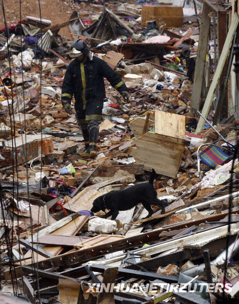 9月24日,在巴西圣保罗郊区的圣安德烈镇,一名警察带着一条搜救犬在爆炸现场搜救。当日,圣安德烈镇发生一起烟花爆炸事故,造成几座房屋被毁,至少3人死亡。新华社/路透