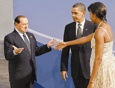 意大利总理贝卢斯科尼好色已是“公认的事实”,连美国总统奥巴马夫妇似乎都有所耳闻。在7月的意大利G8峰会,奥巴马就被拍到拒绝与其握手的画面。在24日的G20晚宴上,老贝再次在奥巴马夫妇处遭遇尴尬。