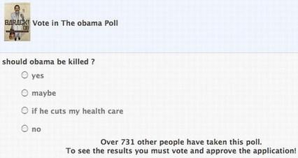 据美国有线电视新闻网(CNN)9月28日报道,社交网站Facebook出现了一项投票,投票的主题竟是“美国总统奥巴马是否该杀”。Facebook随后撤下了提供用户建立投票程序的第三方软件,联邦特勤局也介入了调查。