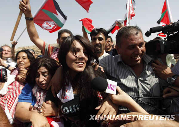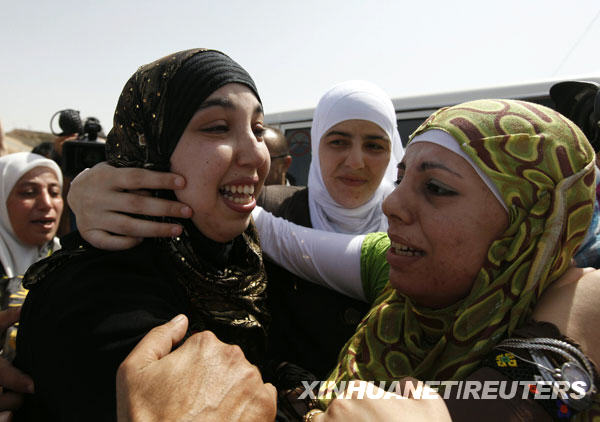 10月2日,在约旦河西岸城市拉姆安拉附近的拜图尼亚检查站,一名刚刚获释的巴勒斯坦妇女(中)受到亲友们的迎接。以色列当日释放了19名在押巴勒斯坦妇女,以交换被俘以军士兵沙利特的一段视频。新华社/路透