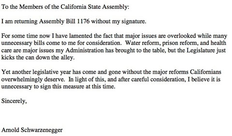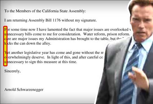 施瓦辛格法案否决信暗藏“玄机”,正文每行第一个字母竖着念能拼成一句话