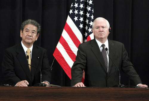 日本防卫大臣北泽俊美(左)与美国国防部长盖茨21日召开联合记者会 图片来源:中国新闻网