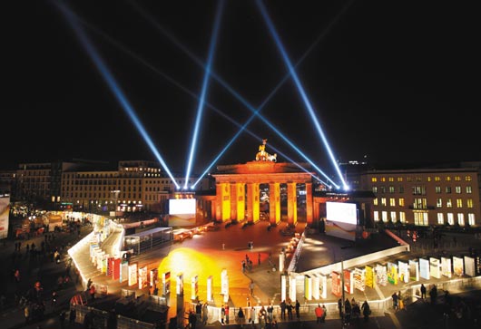 在靠近知名地标布兰登堡大门的围墙旧址上,立起约1000个巨型骨牌,将在9日柏林墙倒塌20周年的纪念日,象征性将它再度推倒。