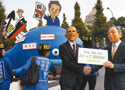 东京环保人士作奥巴马与鸠山由纪夫的扮相,促请美国介入日本以科学调查名义捕鲸,并嘲讽鸠山由纪夫漏报巨额税金的个人丑闻。