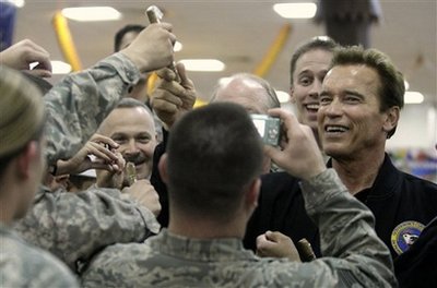 周一,美国加州州长施瓦辛格受到驻伊美军士兵欢迎