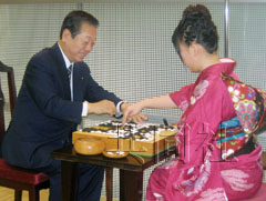 日本民主党干事长小泽一郎23日下午在东京台场与女围棋手谢依旻对弈。(共同社)
