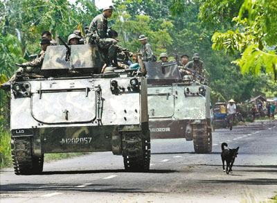 菲律宾南部发生血腥屠杀惨案。图为早前菲律宾军人驶往马京达瑙省。