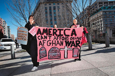 一批反战人士前天到白宫外示威,身穿黑衣服抬棺材抗议,指摘当局为增兵而牺牲医疗和教育改革。多个反战组织2日起在纽约、华盛顿等全美十多个城市,发起一连串示威游行。