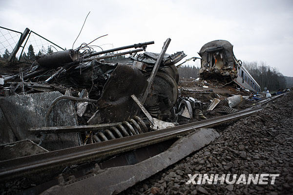 11月28日在俄罗斯特维尔州博洛戈耶市拍摄的俄客运列车脱轨事故现场。新华社记者鲁金博摄