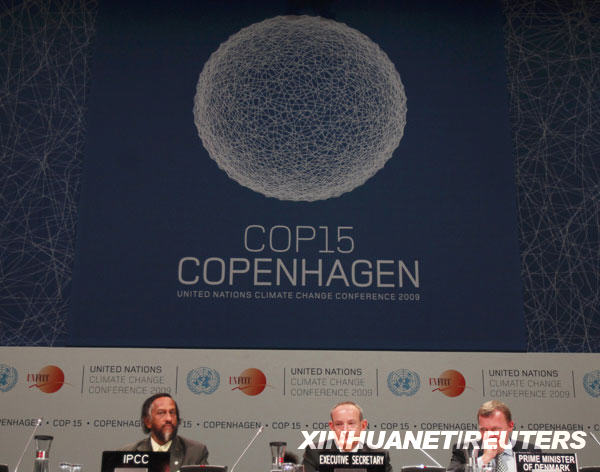12月7日,在丹麦首都哥本哈根,联合国政府间气候变化专门委员会主席拉金德拉·帕乔里(左)、《联合国气候变化框架公约》秘书处执行秘书德博埃尔(中)与丹麦首相拉斯穆森出席开幕式。新华社/路透