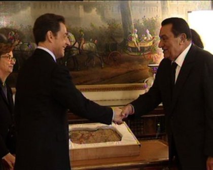 据报道,14日,萨科齐在巴黎会见了前来访问的穆巴拉克,双方在总统府爱丽舍宫享用正式午餐后, 萨科齐交还给穆巴拉克一件埃及文物——法老时期装饰石碑的残件之一。