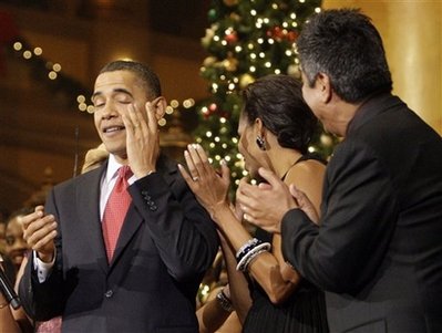 奥巴马在白宫的第一个圣诞晚会,邀请了多名歌手到场表演,不过,可能是因为现场气氛太温馨感人,奥巴马竟在合唱圣歌时偷偷擦掉流下来的眼泪。