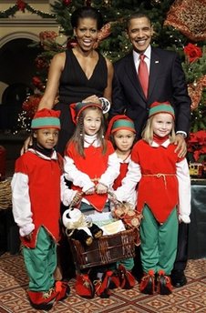 奥巴马夫妇与小精灵们在一起合影。