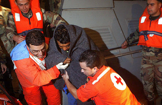 12月18日黎巴嫩的黎波里港,救援人员救起沉船事件的幸存者。