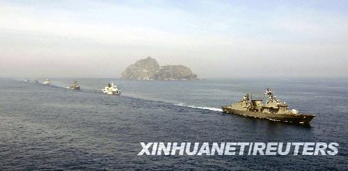 资料图片:2008年7月30日,韩国海军舰船参与在韩国东部海域的独岛(日本称竹岛)周边地区举行的大规模海空军联合演习。