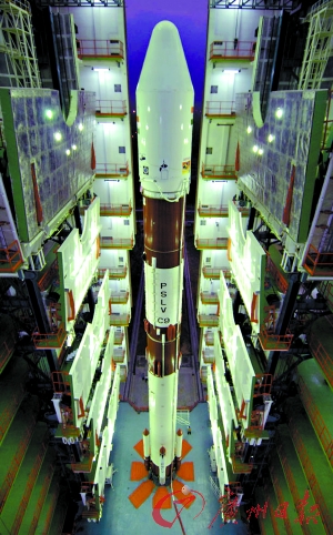 2008年4月, 印度发射“一箭10星” ,图为PSLV-C9火箭在航天发射场的资料照片