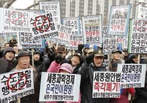 韩国民众在政府大楼前高举标语,表示对修改世宗市规划的支持。