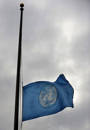 1月13日,美国纽约联合国总部大楼前的联合国会旗降半旗向海地地震中遇难者致哀。根据中国地震台网测定,海地当地时间12日下午发生里氏7.3级强烈地震,造成首都太子港大量房屋受损或倒塌。当地人士认为,地震可能造成大量人员伤亡。新华社记者申宏摄