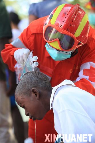 1月14日,中国国际救援队的医务人员在海地首都太子港为伤员进行治疗。当日,中国国际救援队的医护人员来到海地总理府前的广场,为在这里避难的群众进行诊疗,开展医疗救助。加勒比岛国海地当地时间12日下午发生里氏7.3级强烈地震,首都太子港大量房屋倒塌,交通通讯中断,人员伤亡情况至今难以统计,海地领导人估计死亡人数可能超过数万人。新华社记者邢广利摄
