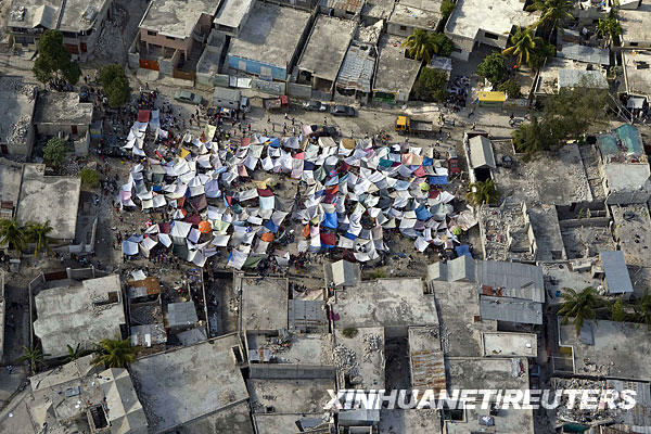 这张由联合国提供的照片显示,人们在海地首都太子港遭到地震损毁的建筑物中间搭起帐篷(1月12日摄)。海地当地时间12日下午发生强烈地震和多起余震,造成首都太子港大量房屋受损或倒塌,当地人士称地震可能造成数万人死亡。新华社/路透