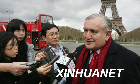 资料图片:2008年4月6日,拉法兰在巴黎埃菲尔铁塔前接受部分中国驻法媒体记者联合采访。