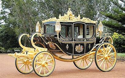 据报道,这辆奢华无比的“黄金婚车”名叫“不列颠尼娅(Brittania)”,由澳洲工匠弗莱.克林顿耗时6年打造。克林顿此前为英国女王伊丽莎白二世制造过多辆专属马车。这辆奢华的“黄金婚车”全车重达2.5吨,高3米,车身上装饰有总计24颗钻石、130颗蓝宝石和超过400片金叶。车身上一百多块木材分别取自伦敦塔、19世纪英国海军名将纳尔逊的“胜利号”战舰以及16世纪亨利八世国王的“玛丽.罗斯号”战舰等重要王室建筑和文物,将是迄今为止英国最具有历史意义的车辆之一。