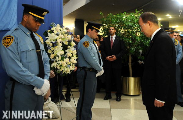 1月19日,联合国秘书长潘基文(右)在纽约联合国总部为海地地震遇难者举行的悼念活动上默哀。当日,联合国总部举行花圈敬献仪式和烛光悼念活动,向在海地地震中遇难的联合国工作人员及所有的地震遇难者表示哀悼。新华社记者申宏摄