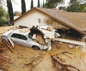 美国洛杉矶暴雨引发泥石流,大量泥巴与石块7日冲进高级住宅区,图中的拉坎纳达岭小区灾情最为严重。此地去年夏天发生森林大火,树木与植被遭到摧毁。