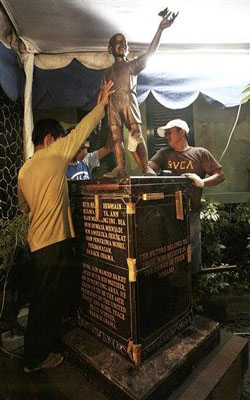 报道称,铜像此前安放在雅加达的一座公园,但由于遭到公众的反对才被重新安置在他曾经就读过的学校,校方的领导和当地的教育官员为这座铜像举行了简短而又低调的揭幕仪式。