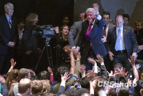 当地时间2月24日下午,美国前总统克林顿在加州大学伯克利分校谈“世界公民”的职责。他指出,当今世界相互依存,相互帮助,共同发展。世界公民应把自己美好的意愿化为实际行动,积极参与世界事务,履行世界公民的职责。图为演讲结束后,克林顿受学生欢迎的场面。 中新社发 陈钢 摄