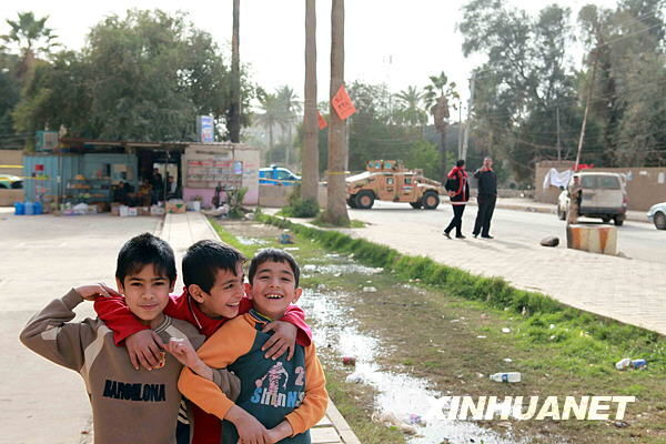 在伊拉克首都巴格达,几名儿童在伊安全部队军车前玩耍。 [资料图片]
