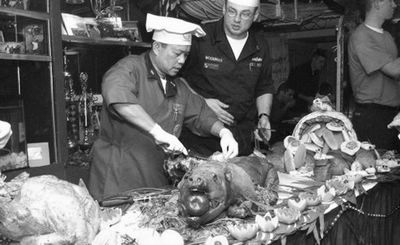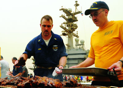 海军官兵还特别期待一些能饱口福的“特殊的日子”,比如在生日会、少数族裔晚宴、星期天午餐会、“墨西哥煎玉米饼餐会”和“冰激凌联谊会”上总能吃到许多可口的特色食物。此外,每天早上厨房还会烤出成箱的饼干送往各部门,这也很受士兵们喜爱。米尔斯和法度透露,航母上士兵们最喜欢的是一道名为“海浪和草地”(龙虾和烤牛肉,作者注)的套餐,不过这种奢侈品一个月只能提供一两次。此外,“斯坦尼斯”号的招牌菜“龙虾天妇罗”也同样受欢迎。