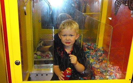 中新网3月14日电 澳大利亚一名2岁男童因为太想吃糖果机里的棒棒糖,居然想办法从掉糖果下来的小窗口钻进去,却把自己困在这个大玻璃箱里。据“中央社”报道,男童科恩-斯通(Cohen Stone)跟着妈妈琪拉(Kyra)到一间意大利餐厅参加大人的聚会,席间调皮的爬进一部抓糖果机,却怎么样也出不来。