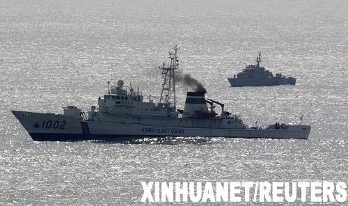 3月27日,一艘韩国军舰(前)与一艘韩国海事警察巡逻船在朝鲜半岛西部海域执行搜救任务。韩国YTN电视台27日援引总统府青瓦台消息人士的话报道说,26日晚沉没的韩国海军“天安”号警戒舰很可能是因遭遇水雷而发生爆炸,爆炸产生的破洞最终导致警戒舰沉没。新华社/路透