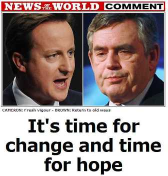 该报说,经过深思熟虑,《世界新闻报》相信卡梅伦和他的保守党应当被给予执政的机会,“眼前,他们(保守党)寄托着我们对光明、合理、安全和更有荣誉的未来。”